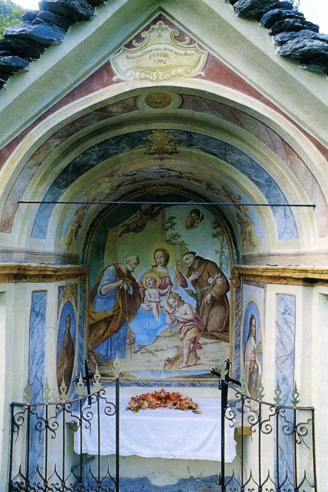 Ai lati, in piedi ma in atteggiamento adorante, S. Giuseppe e S. Antonio da Padova. Alcuni Angioletti in alto, ed altri nell'arco della volta dove campeggia un Padre Eterno.
